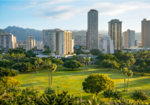 Downtown Honolulu Hawaii skyline with mountains in the background