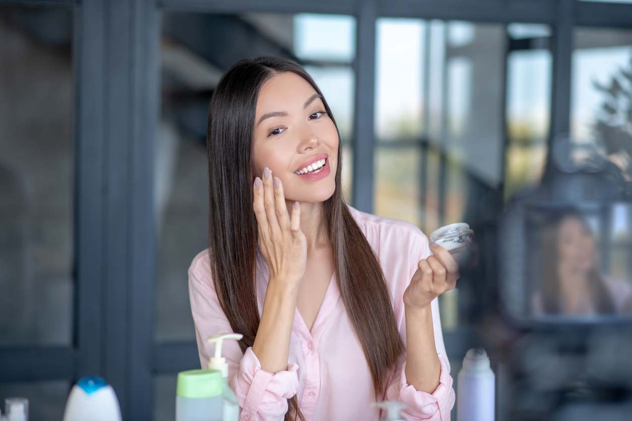 Moisturizing cream. Smiling beautiful woman smiling while applying moisturizing cream