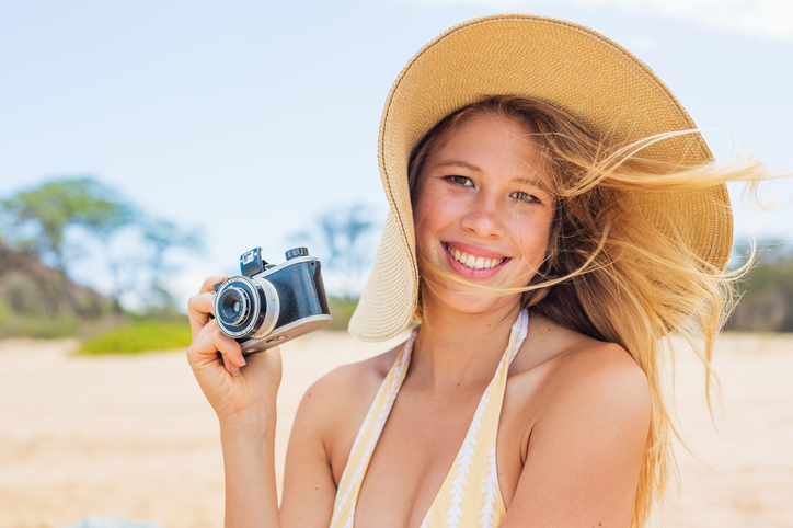 Beautiful Young Woman at the Beach with Vintage Camera